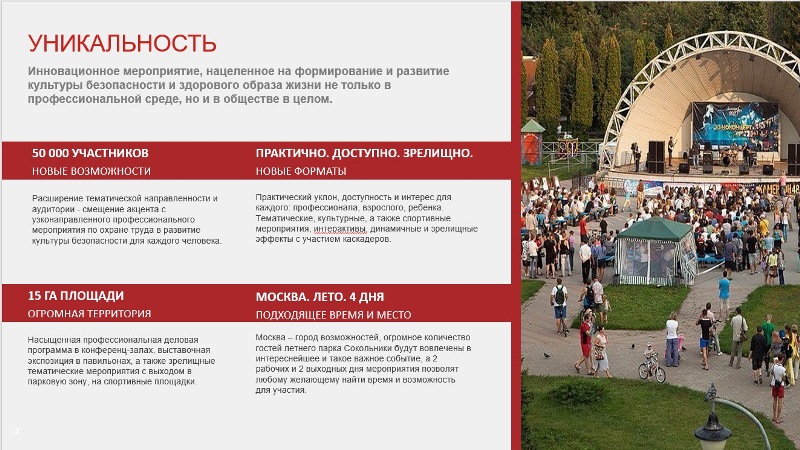 В период с 21 по 24 июня 2018 г. в парке «Сокольники» пройдет IX Городская выставка «Охрана труда в Москве — 2018». В этом году в рамках выставки впервые будет проведен Московский городской фестиваль здоровья и безопасности. Два рабочих и два выходных дня мероприятия позволят любому желающему найти время и возможность принять участие в его насыщенной программе.