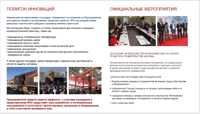 Фестиваль представит уникальную интерактивную площадку, специально построенную и оборудованную для демонстрации и тестирования защитных свойств продуктов производителей средств индивидуальной защиты под воздействием реальных опасностей и вредных производственных факторов.