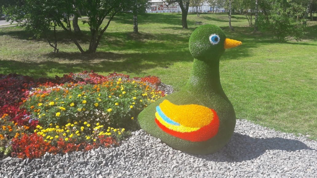 В Бирюлево Восточное к благоустройству территории возле прудов подошли очень творчески. В этом году здесь можно полюбоваться красавцем — павлином, гигантскими божьими коровками, прекрасной бабочкой. Все фигуры, словно сошедшие со страниц детских сказок, выполнены из цветов и зелени.
