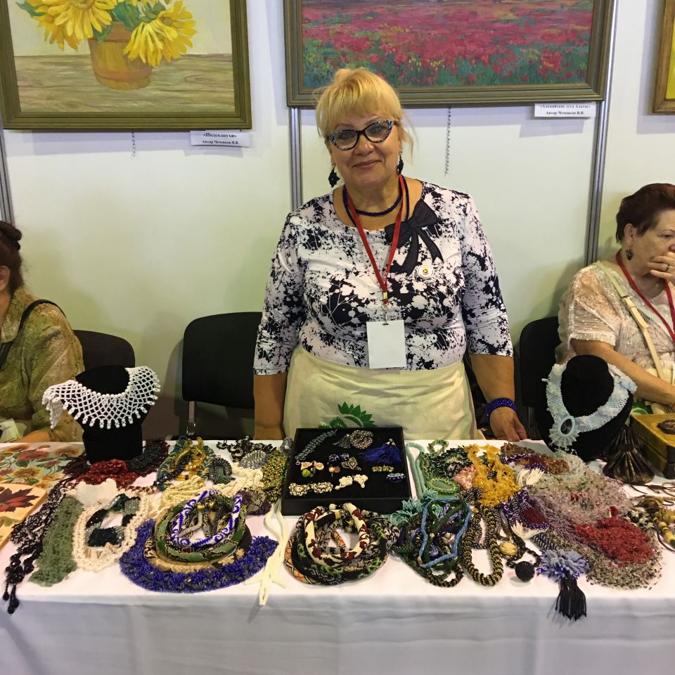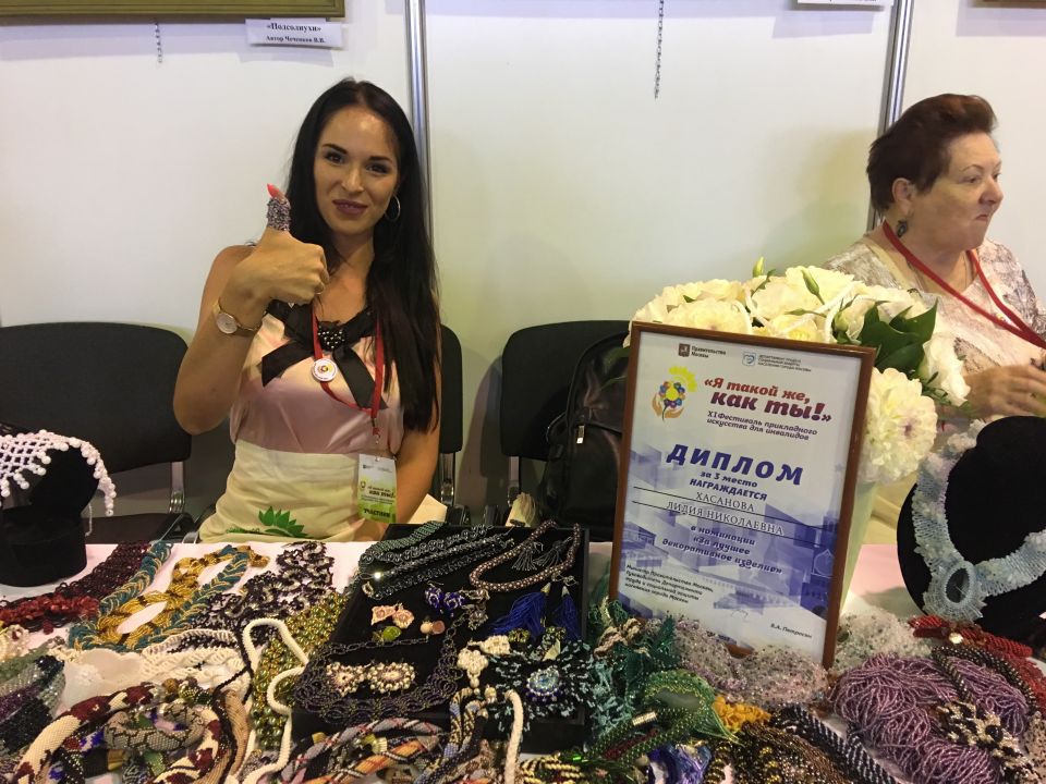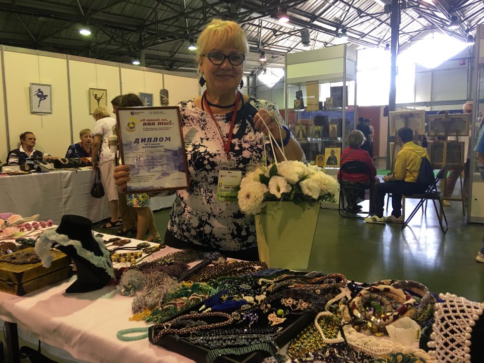 На этом фестивале Лидия Хасанова продемонстрировала множество разных украшений из бисера, броши, бусы, серьги, браслеты, колье и ожерелья. Лидия Николаевна ведет мастер-классы для людей пенсионного возраста в центре соцобслуживания.
