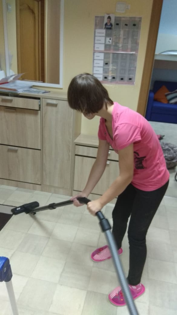 Перед нами стоит важная задача – ежедневное обучение наших воспитанников навыкам самообслуживания, общения, поведения в быту и общественных местах, самоконтролю. Ребята самостоятельно (под руководством педагогов сопровождения) живут в оборудованной в центре квартире, учатся вести домашнее хозяйство (убираться в доме, готовить себе еду, стирать). Некоторые дети уже освоили основные приёмы нарезки продуктов, учатся варить крупы, сервировать стол, мыть посуду, пылесосить, протирать пыль, мыть пол, раскладывать и складывать гладильную доску – все это им нравится, потому что получается. Одним словом, обычная жизнь обычных людей. Таким образом мы готовим их к взрослой самостоятельной жизни».