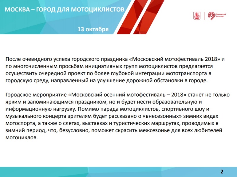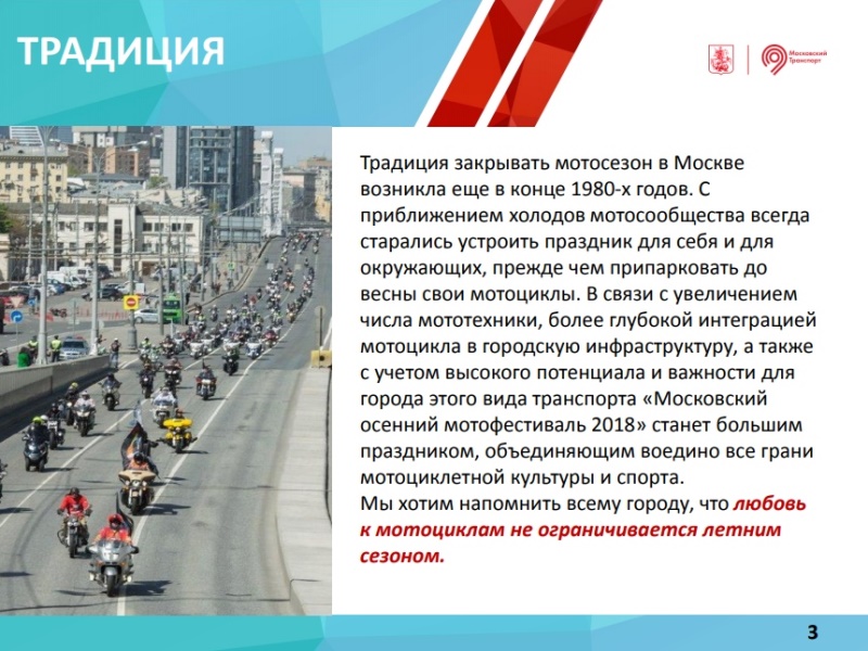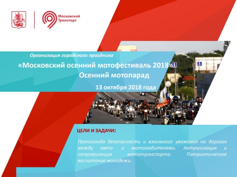 Департамент транспорта и развития дорожно-транспортной инфраструктуры города Москвы ведет активную подготовку мероприятия «Московский городской осенний мотофестиваль – 2018», приуроченного к закрытию мотосезона.