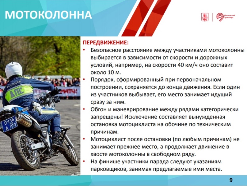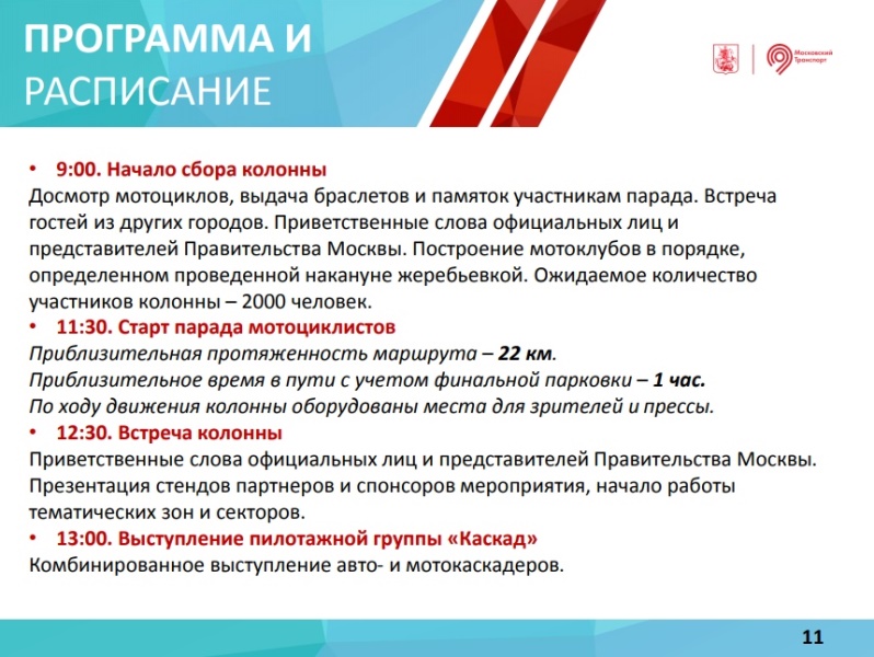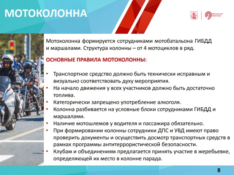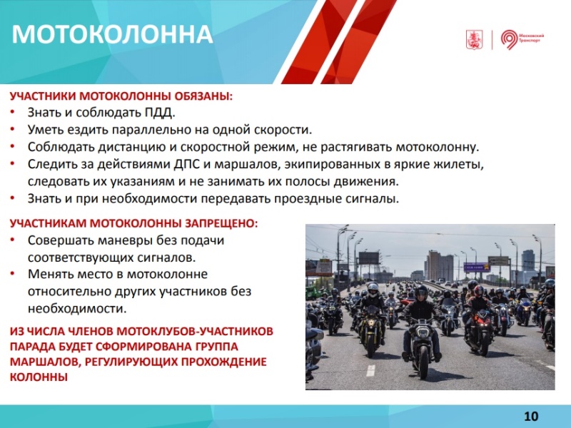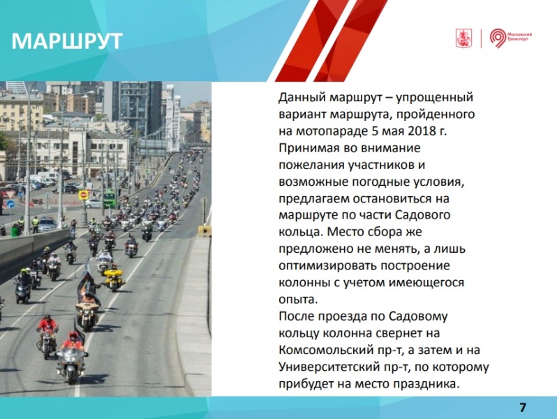 Мотопарад пройдет 13 октября 2018 г. по Садовому кольцу со стартом на проспекте Академика Сахарова и финишем на Воробьевых горах. Сбор участников — с 09:00 до 11:00 на проспекте Академика Сахарова, заезд с Каланчевской улицы.