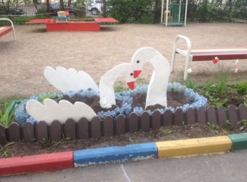 По ее словам, участок, где гуляют дети, был украшен своими руками. Задумав облагородить территорию, сотрудники детского сада отталкивались от названия улицы, на которой живут многие воспитанники – улица Лебедянская. В результате в цветнике появились две клумбы, украшенные белыми лебедями, смотрящими друг на друга.