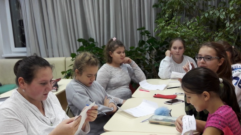 – Потом им нужно было составить предложение рандом. Ребята отвечали на предлагаемый вопрос и, завернув ответ на листе, передавали его рядом сидящему человеку. В результате, обойдя круг, листок вернулся к автору, и все с азартом читали полученную абракадабру, – рассказала Елена Валентиновна.