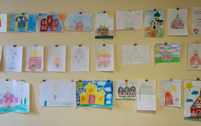 Ребята принесли в школу рисунки на тему «Наш храм», большинство из которых было посвящено бирюлевскому храму. Но были и такие, в которых дети изобразили другие православные церкви. Самым маленьким участникам конкурса 4-5 лет, а старшим – 14.