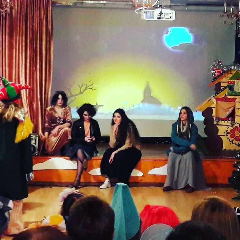 В среду школьники играли в учебном корпусе (ук) № 11 на базе начальной школы. По словам учителя музыки, здесь на сцену удалось пустить компьютерную проекцию, так что за актерами был настоящий анимированый зимний лес. А 27 декабря ученики показали спектакль в ук № 7.