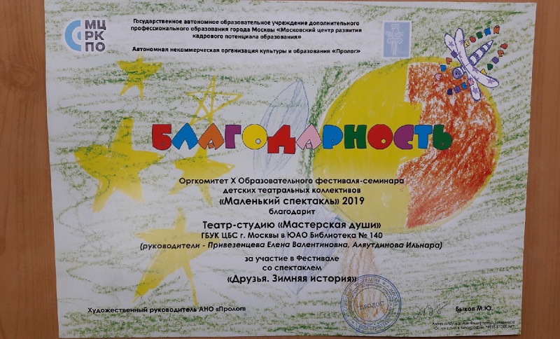 Юные бирюлевские артисты показали спектакль «Друзья. Зимняя история». По словам руководителя театра-студии, после каждого спектакля организаторы проводили конкурс на внимательного зрителя. Некоторые из ребят рисовали свои впечатления от увиденных постановок, а другие соревновались в музыкальности. По результатам мероприятия «Мастерская души» получила благодарность от организаторов, дипломы и подарки.