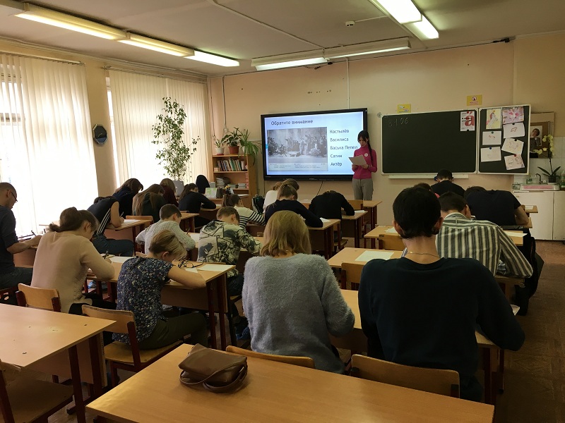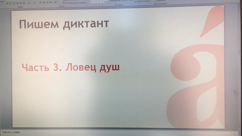 Сначала собравшимся рассказали о правилах акции: как заполнять бланк, когда и где можно узнать свою оценку и так далее. Потом участникам показали видеообращение Павла Басинского, в котором он рассказывал о важности знания своего языка. И только после этого ведущий библиотекарь Анна Беляева стала зачитывать текст «Ловец душ», посвященный пьесе Максима Горького «На дне».