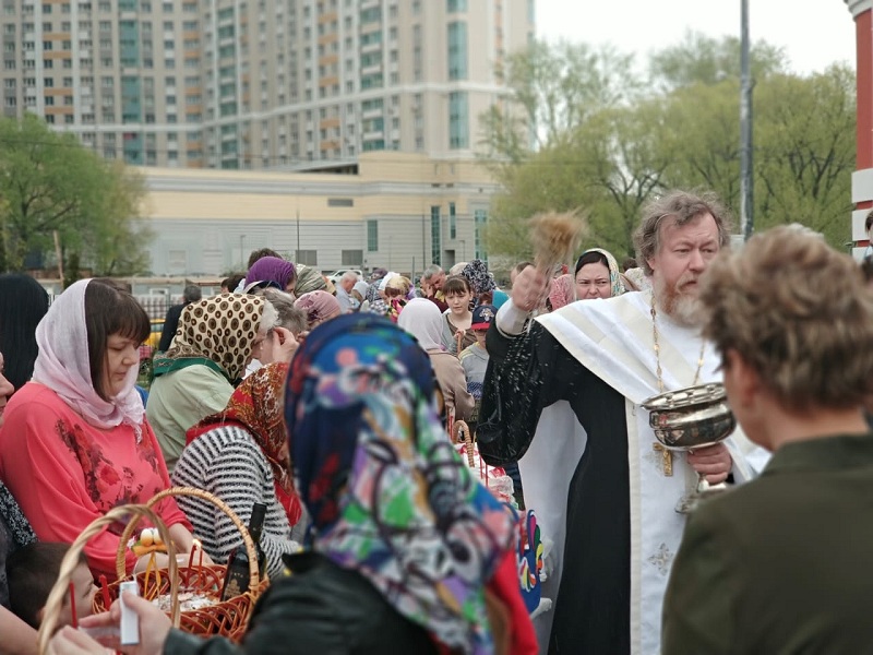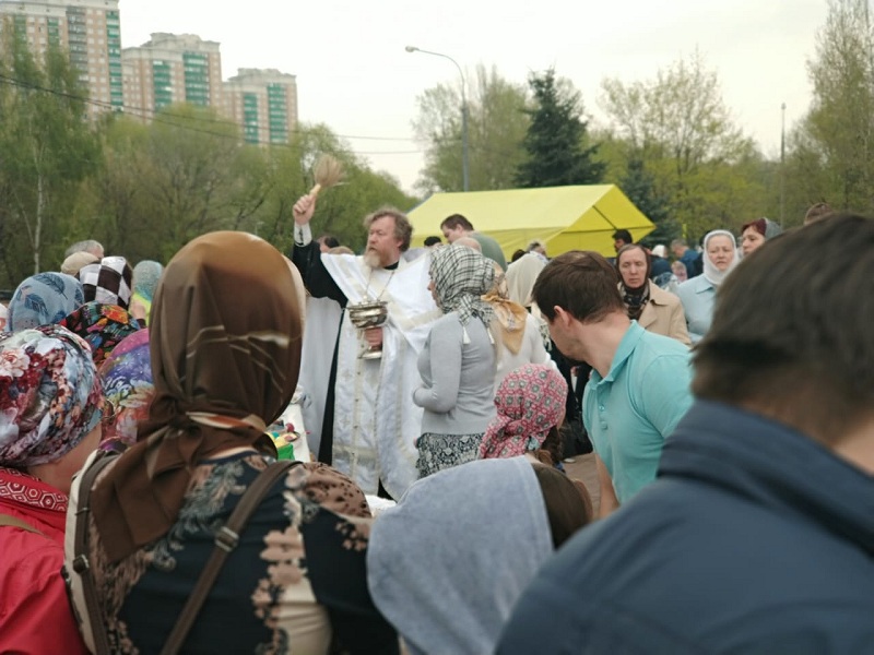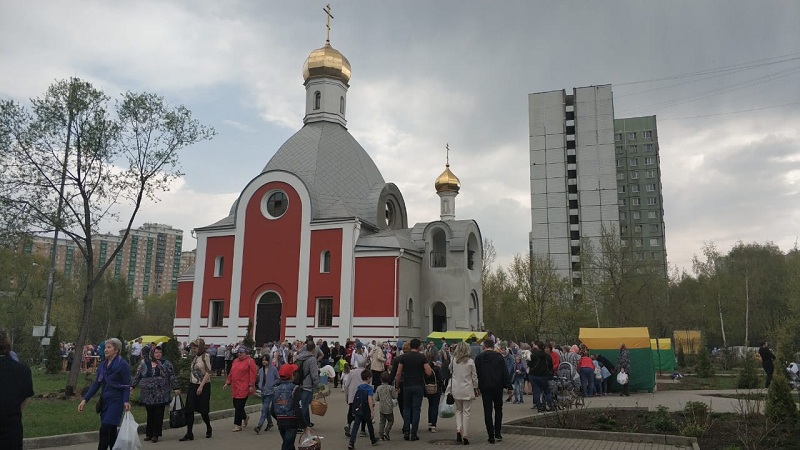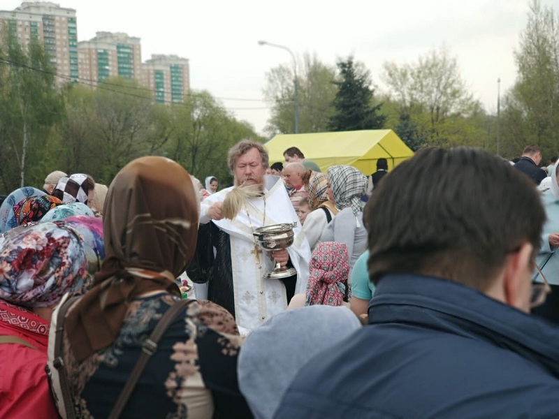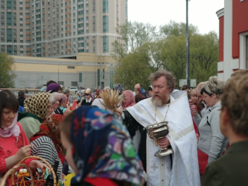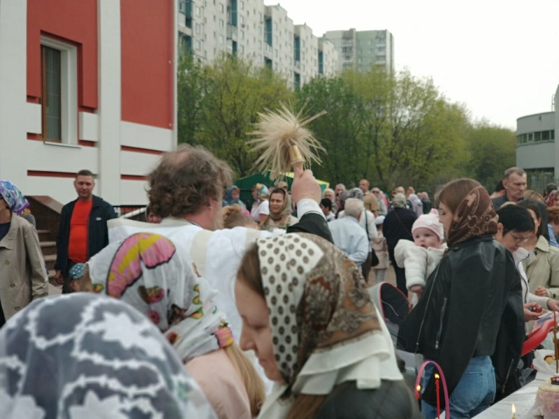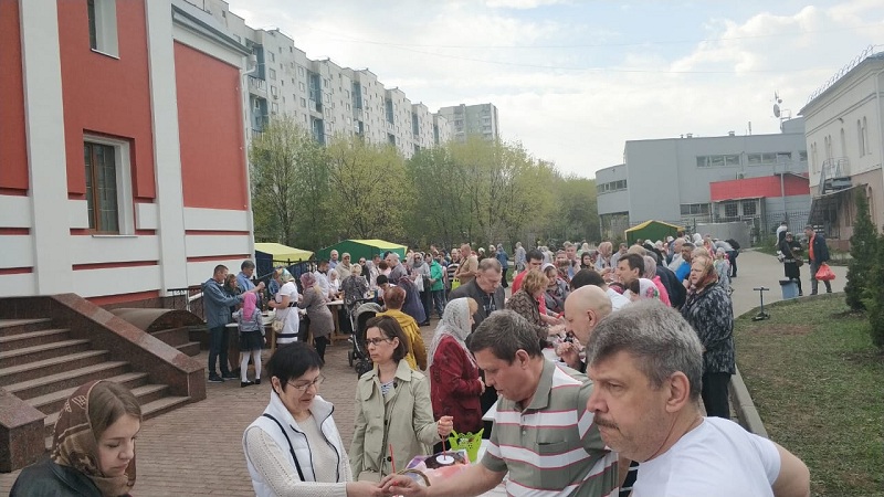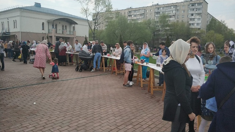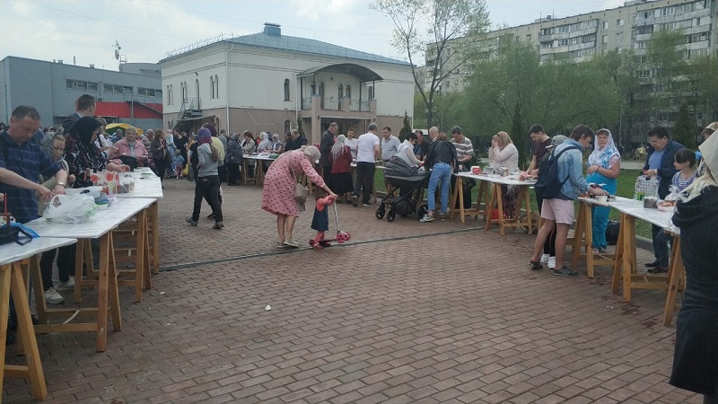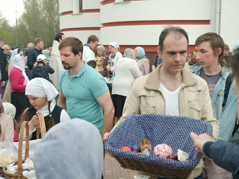 Около храма можно было купить церковную утварь, освященные куличи и различные пасхальные поделки. Столы для проведения обряда освящения принесенных прихожанами куличей, крашеных яиц и творожной пасхи были установлены полукругом вдоль храма. Помимо этого прихожане побывали на праздничных пасхальных службах.