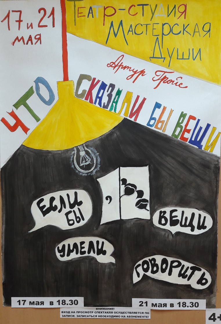 Так, 17 и 21 мая младшая группа выступит с показом спектакля «Что сказали бы вещи, если бы умели говорить?», созданного по мотивам произведения писателя Артура Гройса. Начало в 18:30.