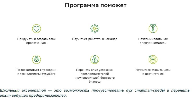 Для учеников программа стала одним из направлений профессиональной ориентации, в котором с помощью практических занятий каждый научится создавать собственный бизнес и попробует себя в роли предпринимателя. Таким образом, подростки познакомятся с новыми трендами и технологиями. В процессе обучения они будут ставить перед собой цели и задачи по программе проекта, а также добиваться их реализации. Делать это ребята будут, как индивидуально, так и командно.