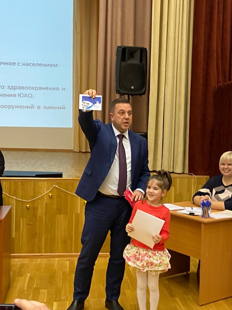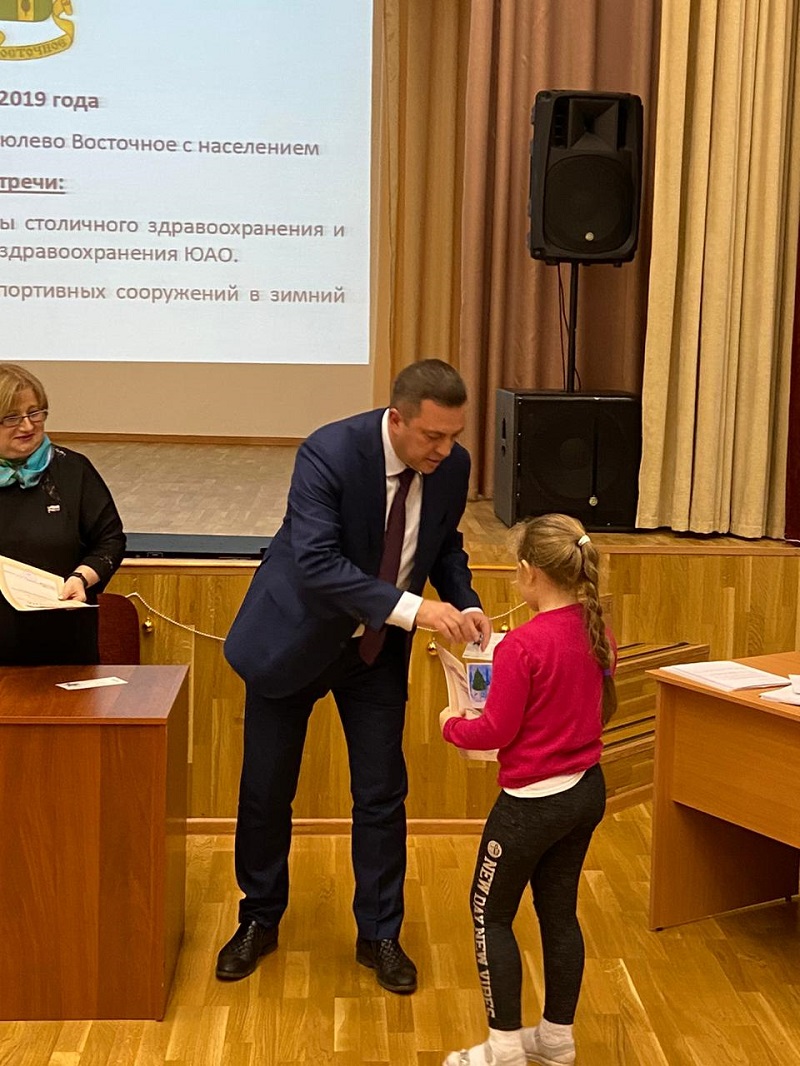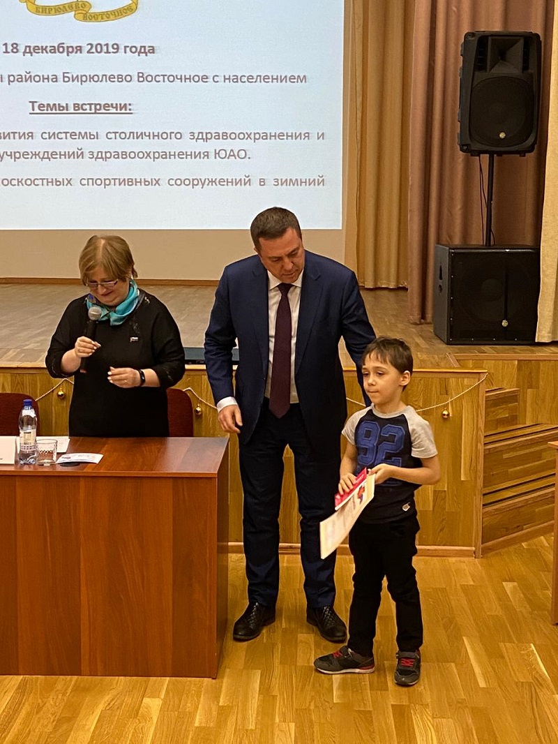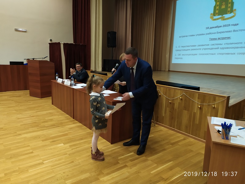 18.12.2019 глава управы на встрече с жителями поздравил маленьких художников — победителей конкурса и наградил их грамотой и билетом на новогоднюю ёлку.