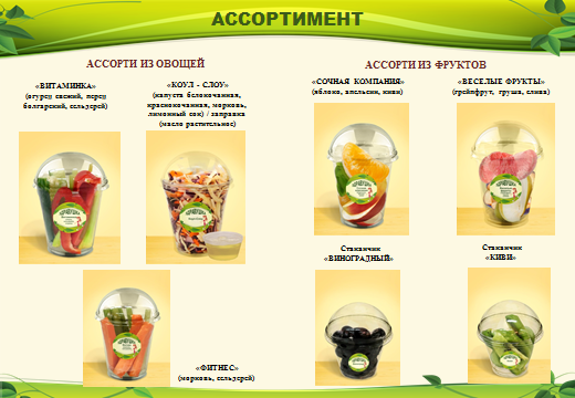 Для этой группы потребителей была разработана специальная фреш-линия «Здравушка». В ней представлено свежее ассорти из овощей и фруктов, которое подается порционно в современной прозрачной упаковке. Таким образом в школьных буфетах ребята могут выбрать стаканчики: «Сочная компания» (яблоко, апельсин, киви), «Веселые фрукты» (грейпфрут, груша, слива), «Виноградный», «Киви». Также ребята могут перекусить следующими видами ассорти – ассорти «Витаминка» (огурец, перец болгарский, сельдерей), «Фитнес» (морковь, сельдерей), «Коул-Слоу» (капуста белокочанная/краснокочанная, морковь, лимонный сок).