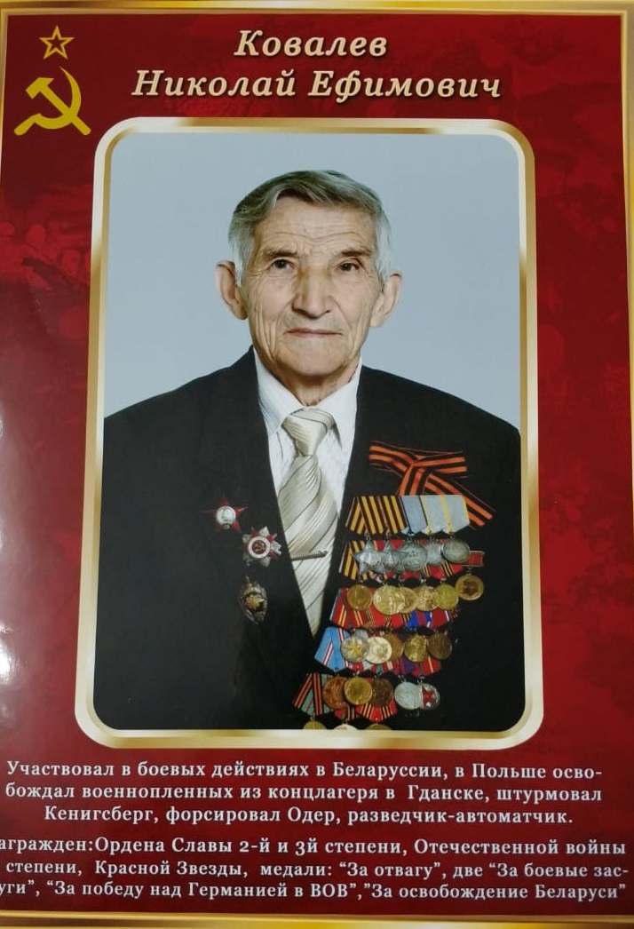 Смелого пуля боится, и штык не берет. Именно этими словами ветеран Великой Отечественной войны Николай Ефимович Ковалев ответил на вопрос, что помогло ему пережить те страшные годы. На его плечи выпала нелегкая доля. Будучи юношей, он оказался в суровых военных условиях: участвовал в боевых действиях в Белоруссии, освобождал военнопленных из концлагеря в польском Гданьске, штурмовал Кенигсберг, форсировал Одер…