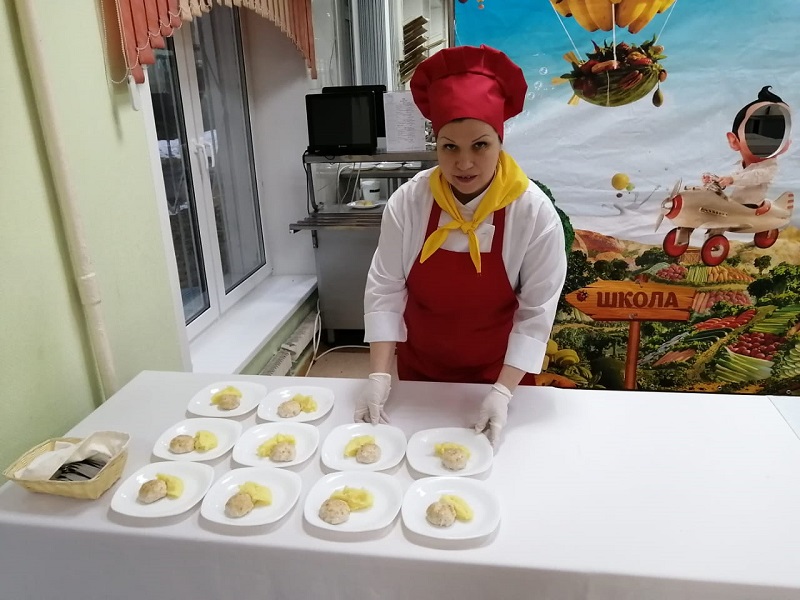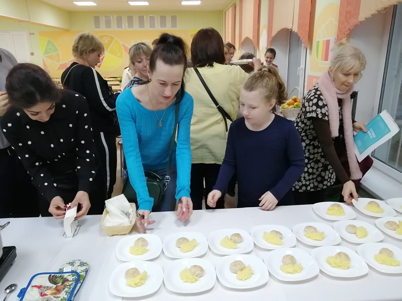 В школьной столовой гостей встретили шеф-повара Ольга Кондакова и Сергей Купарев, которые сообщили, что одним из любимых блюд учеников являются куриные биточки с картофельным пюре. Поэтому Ольга и Сергей решили раскрыть родителям секрет приготовления этого кушанья. Кроме того, рецепт довольно прост – его могут освоить даже юные кулинары.