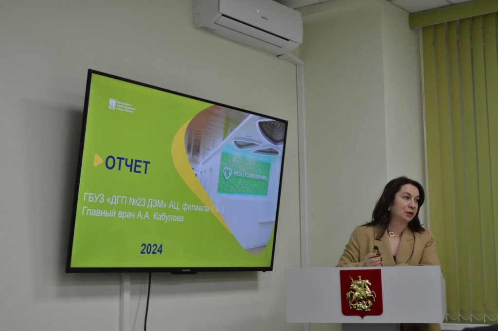 Следующей перед депутатами выступила главный врач Детской городской поликлиники №23 Анжела Кабулова. Она рассказала об успешном завершении ремонта в корпусах медицинского учреждения. Также главный врач отметила, что в 2024 году под управление ДГП №23 перешли несколько новых зданий, которые были обновлены под стандарты московских поликлиник.