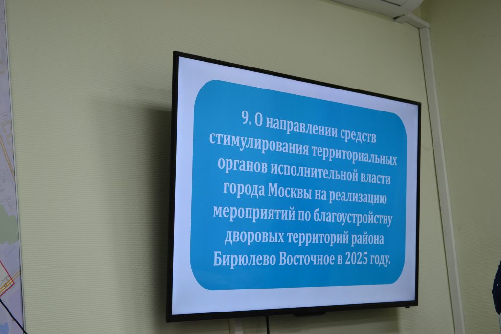 В ходе встречи Совет депутатов согласовал направление средств стимулирования территориальных органов исполнительной власти города Москвы на реализацию мероприятий по благоустройству дворовых территорий района Бирюлево Восточное в 2025 году. Дополнительно был согласован ежеквартальный план мероприятий для населения и повестка апрельского заседания.